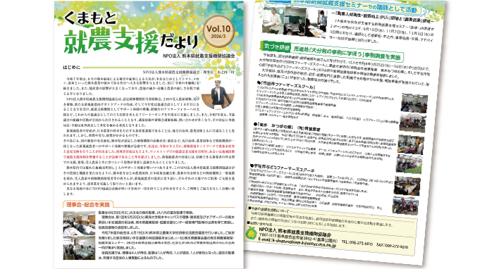 2026.04.2 くまもと就農支援だより 協議会 くまもと就農支援だより 2026年3月Vol.10 はじめに 理事会・総会を実施 認定研修機関担当者研修会の開催 第1回受入農家研修会を開催 ガイドブックへ数多くの注文 ガイドブック続編「新規就農者向け手引き(仮称)」作成中 全国各地からの講演・研修会講師の依頼が殺到 第2回受入農家研修会を開催 NPO法人熊本県就農支援機関協議会連携会議及び意見交換会を実施 熊本県新規就農支援セミナーでの講師として活動 気づき研修・取材を実施