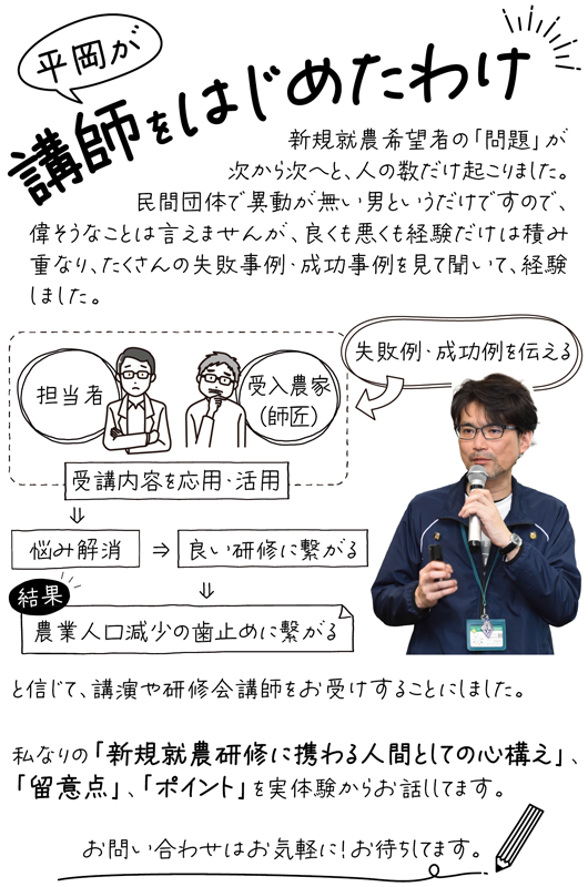 皆様のお仕事は、この国にとって喫緊の最重要課題です。「どうせやるなら前向きに」の気持ちで一緒にボチボチやっていきませんか?私がこれまでの新規就農に携わる人生から得た教訓、経験、矜持が、少しでも皆様のお役に立つことがあれば幸いです。